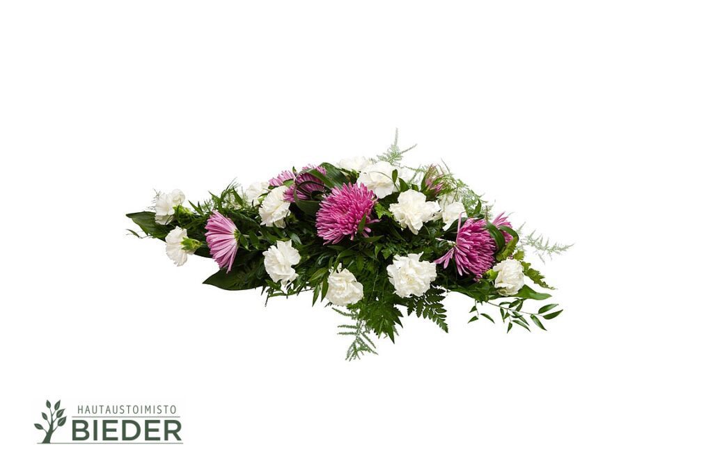 Arkkulaitteessa on valkoista neilikkaa ja roosaa suurikukkaista krysanteemia ja koristevihreää.